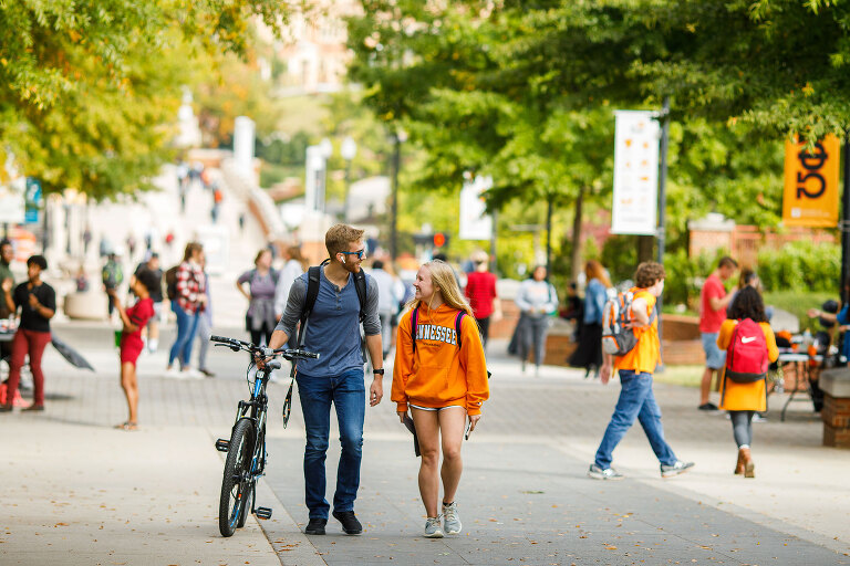 Students visit while walking up Ped Walkway on the University of Tennessee campus..