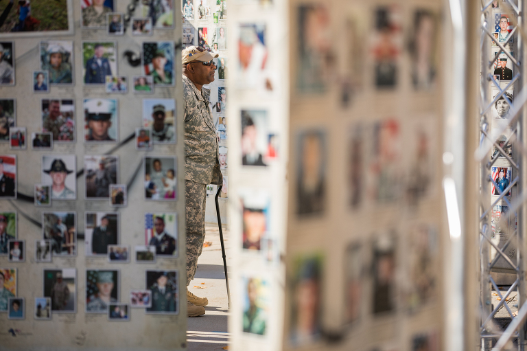 On Veterans Day, an Army Sgt takes time to remember those that gave their life for our country as the National Gold Star Memorial “Remembering Our Fallen” is displayed along the pedestrian walkway.