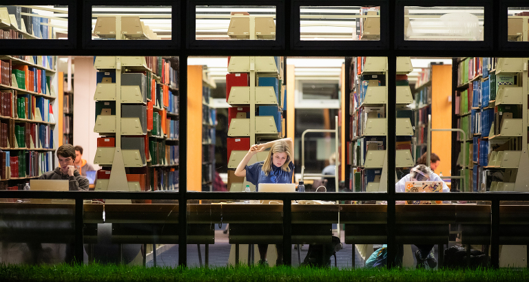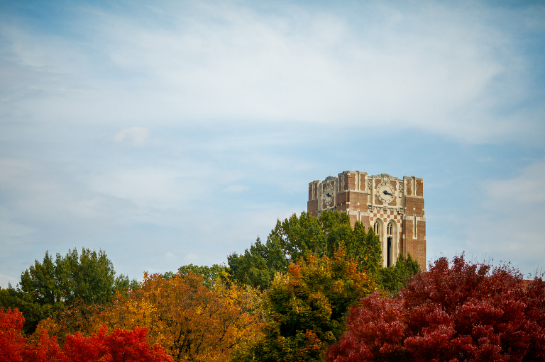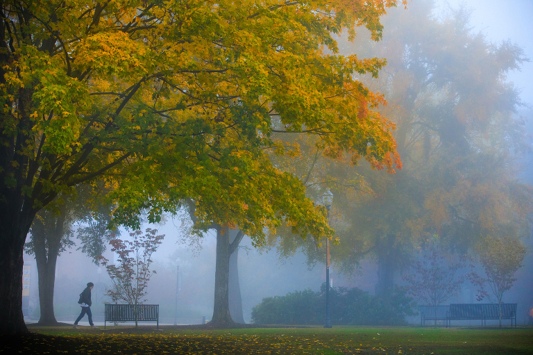 Finding relevant features for our social media account is a big part of what I do. When driving into work one day, fog had blanketed all of campus. As soon as I got into the office, I grabbed my camera and went searching for the contrast of a student walking through the fog. I got lucky that the trees outside of our building where still full of fall color.
