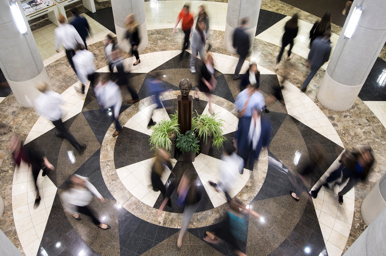 People walk around the rotunda of the Howard H. Baker Jr. Center for Public Policy where Howard Baker’s bust marks the center of the room.