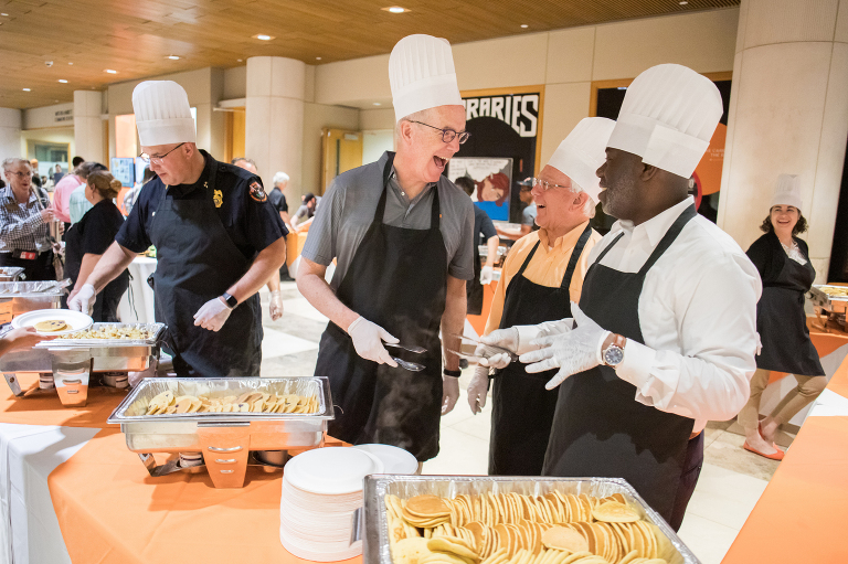 Interim Chancellor Wayne Davis jokes with Provost David Manderscheid and Tyvi Small, Vice Chancellor for Diversity and Engagement, while serving students during a Pancake Supper in Hodges Library Galleria.