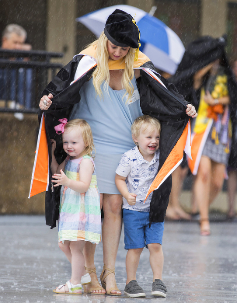 A mother protects her children from the rain with her gown while leaving commencement. This is a prime example of being in the right place at the right time and because of that I captured one of my favorite images of the year.
